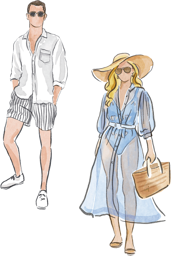 Women: Chic, colorful cover-ups, kaftans, and effortless resortwear. Please avoid white.